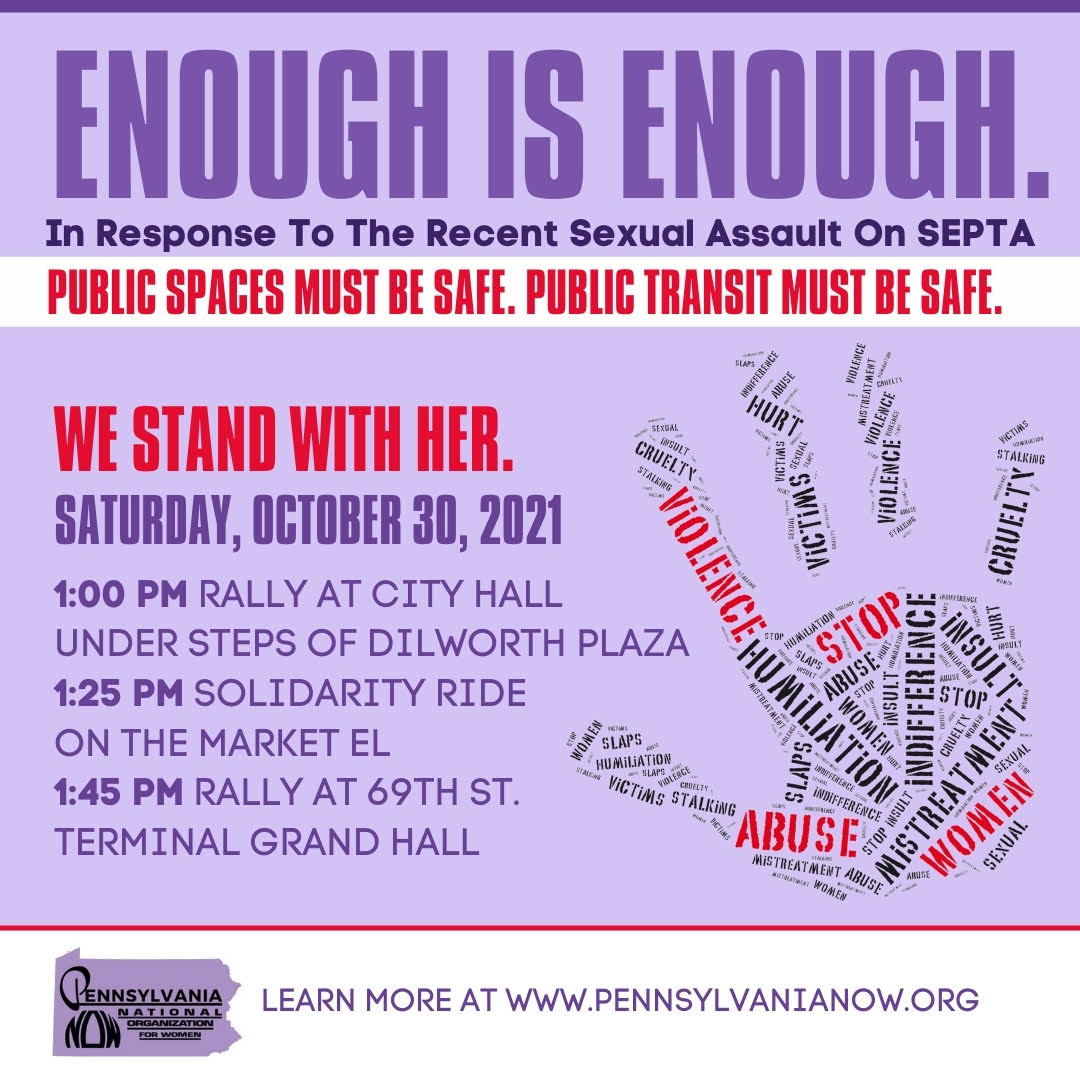 Dear Concerned Community Member: Please join Pennsylvania National Organization for Women (PA NOW) and Philadelphia NOW for a rally to show support for the survivor of the horrific sexual assault on SEPTA on October 13, 2021. We have organized this rally to demand accountability and transparency from SEPTA, law enforcement, elected officials, administrations-state, local, and…